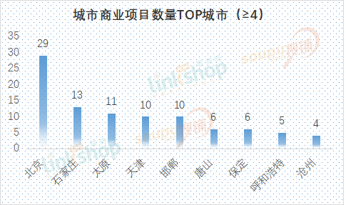 從各城市新增商業(yè)項目數(shù)量來看,新增4家及以上擬開業(yè)的城市有北京、石家莊、太原、天津、邯鄲、唐山、保定、呼和浩特和滄州。其中,作為省會城市,石家莊擬新開業(yè)項目達13家,太原擬新開業(yè)項目達到11家。這些上榜城市多為直轄市、省會城市或者省級副中心城市。