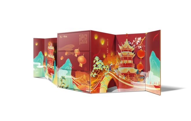 其中,“萬家燈火”禮盒以中華第一燈“長信宮燈“為創作靈感,禮盒展開是一整幅的萬家燈火畫面,寓意萬家燈火點亮國人的親情守望,以及對新一年的美好期盼。“瑞氣東升”禮盒以現存最早的摹繪世界地圖“坤輿萬國全圖”為靈感,禮盒展開后會升起全幅原創手繪的萬里江山圖,世界珍寶盡現眼前,寓意持有者一帆順風,富甲四方,祈福迎新。