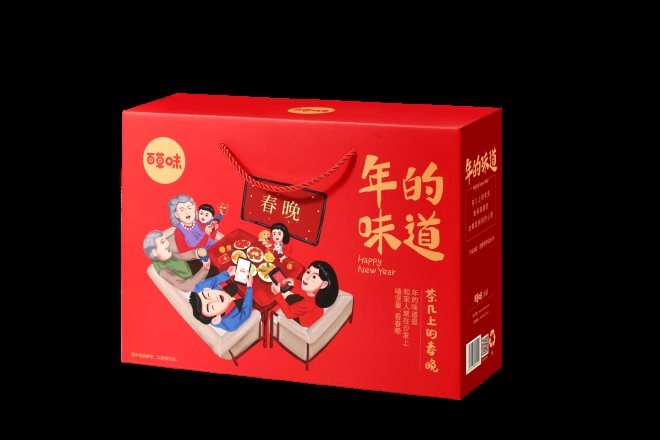 (百草味“年的味道”系列之茶幾上的春晚禮盒)