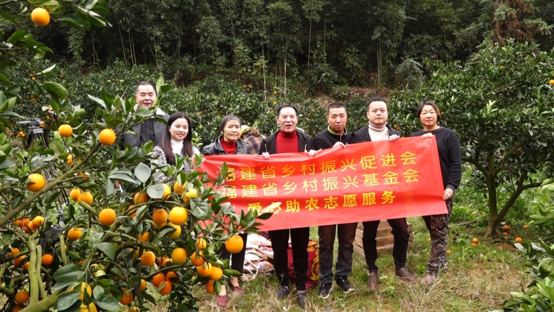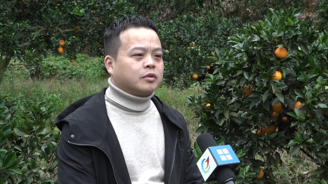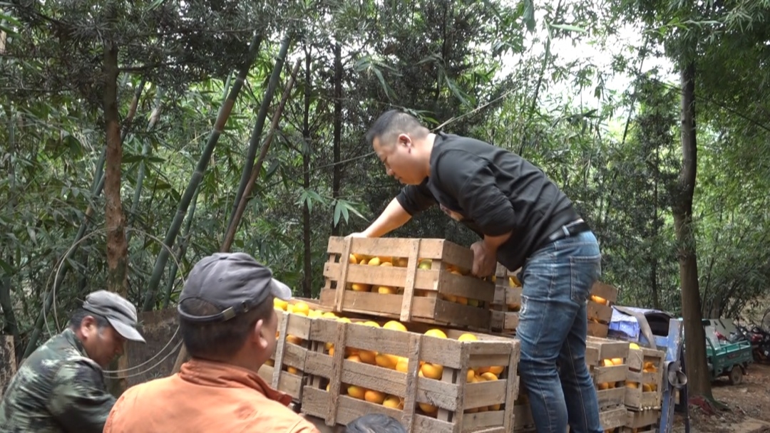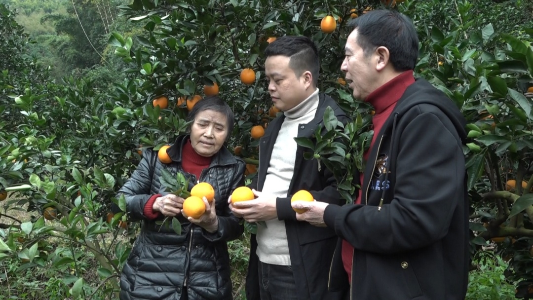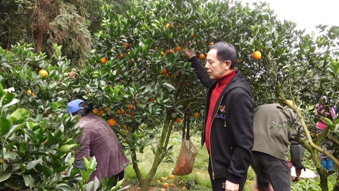 果園里橙香四溢,黃澄澄的臍橙掛滿枝頭,工人們嫻熟的將臍橙摘下。果樹下,幫助朱招弟與永輝牽線搭橋的愛(ài)心人士游厚壽也來(lái)看望朱招弟一家。